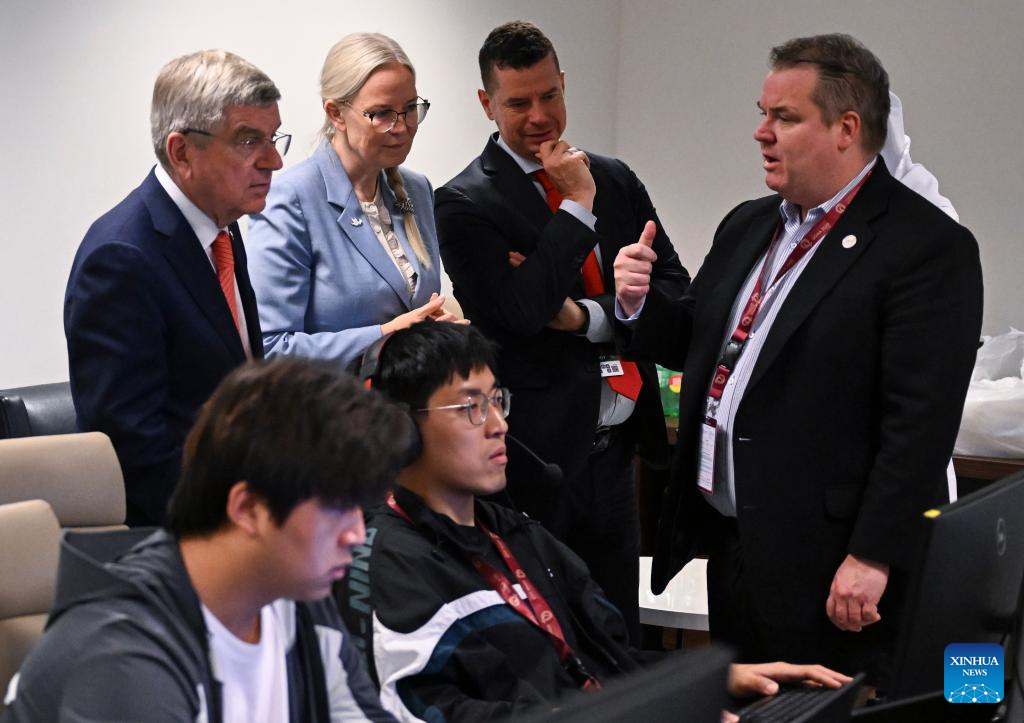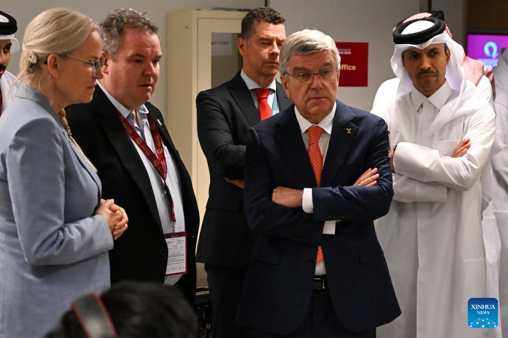 President of the International Olympic Committee (IOC) Thomas Bach (front R) pays a visit to the Table Tennis Review operating team at the ITTF World Table Tennis Championships Finals Doha 2025 in Doha, Qatar, May 23, 2025. (Xinhua/He Changshan)