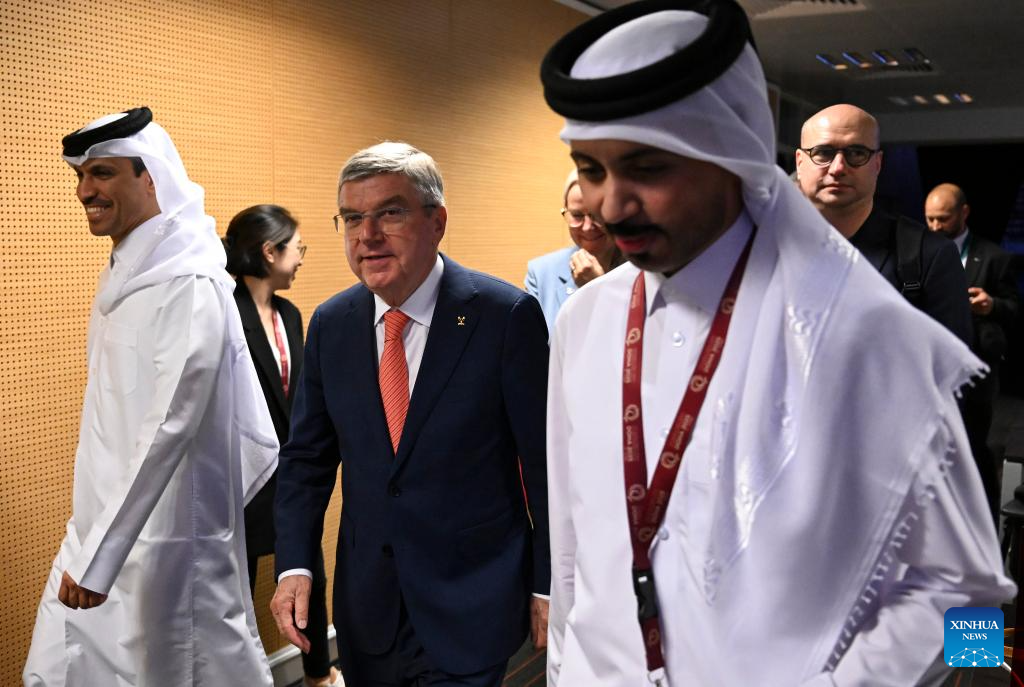President of the International Olympic Committee (IOC) Thomas Bach (front C) pays a visit to the working area at the ITTF World Table Tennis Championships Finals Doha 2025 in Doha, Qatar, May 23, 2025. (Xinhua/He Changshan)