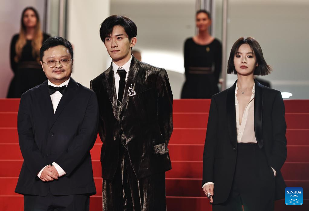 Director Bi Gan (L), Yi Yangqianxi (C) and Li Gengxi (R) arrive at the red carpet before the premiere of the film "Resurrection" during the 78th edition of the Cannes Film Festival in Cannes, southern France, on May 22, 2025. The 78th edition of the Cannes Film Festival kicked off in Cannes on May 13, with Chinese film "Resurrection" directed by Bi Gan competing for the festival's highest honor, the Palme d'Or alongside 21 other films. (Xinhua/Gao Jing)