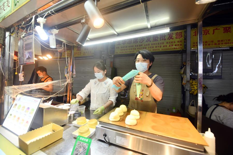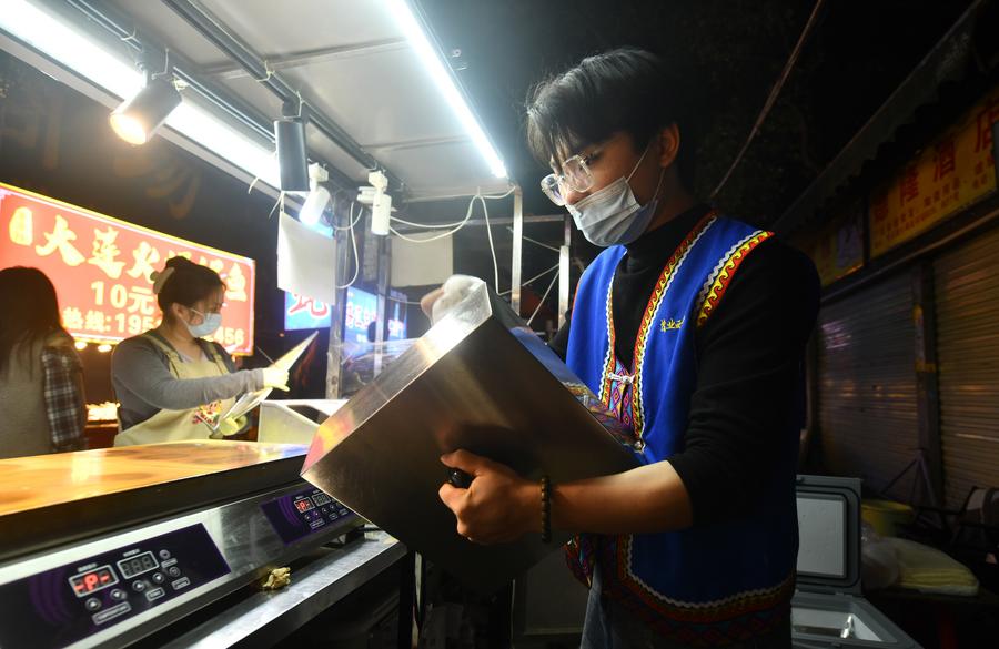 NANNING, May 23 (Xinhua) -- Lu Yiding, 29-year-old, and his girlfriend Wang Fufu run a cake stall at Nanning's bustling Xiguan night market. Each evening from around 6 p.m. until the early hours of the next morning, this "post-95" couple works tirelessly preparing food ingredients, baking cakes, and interacting with customers.