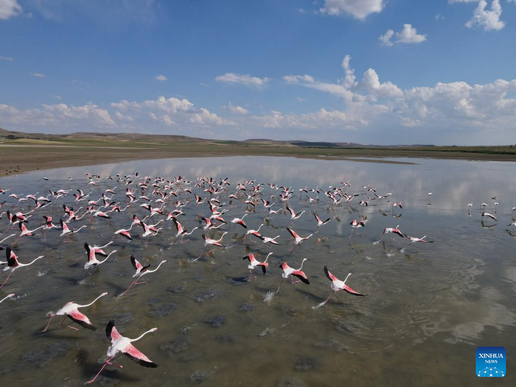 Flamingos are seen at the Sel Kapani Dam Lake in Ankara, Türkiye, May 23, 2025. (Mustafa Kaya/Handout via Xinhua)