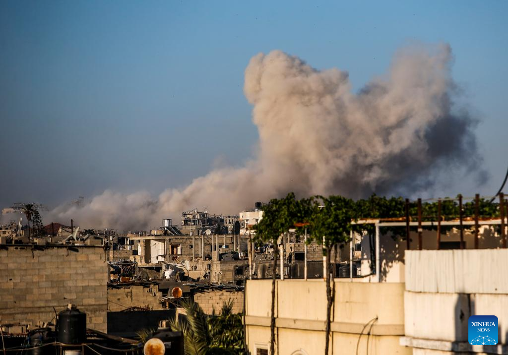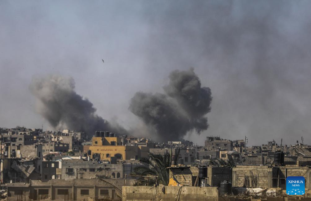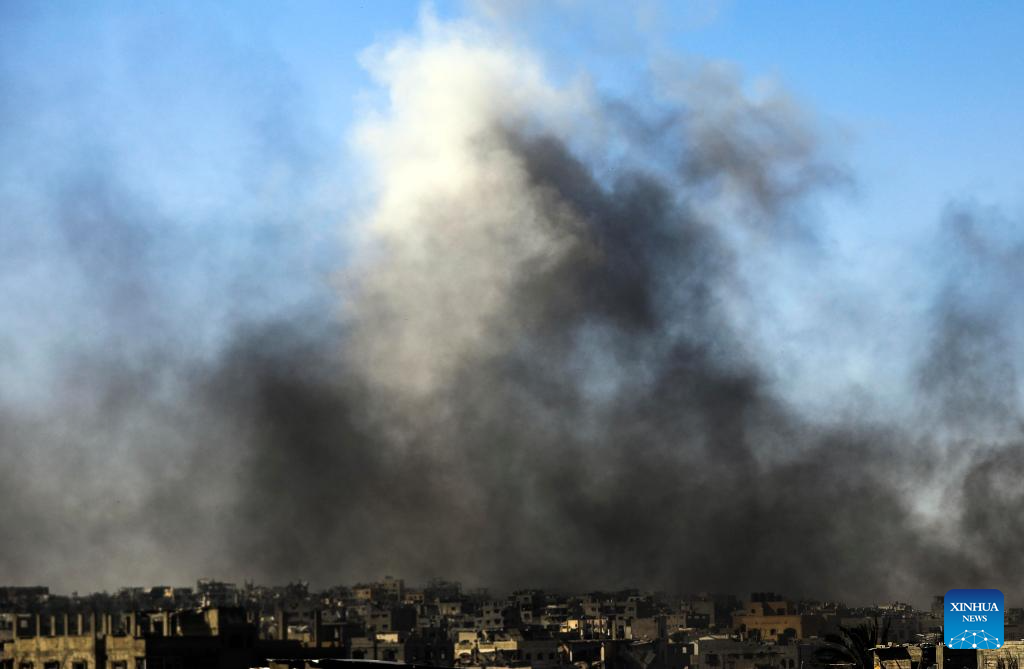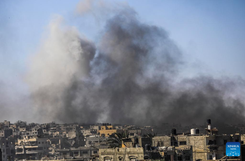 Smoke rises following an Israeli airstrike in Jabalia refugee camp, northern Gaza Strip, on May 24, 2025. At least 32 Palestinians were killed in Israeli airstrikes on multiple areas of the Gaza Strip on Saturday, according to Gaza's Civil Defense. (Photo by Mahmoud Zaki/Xinhua)