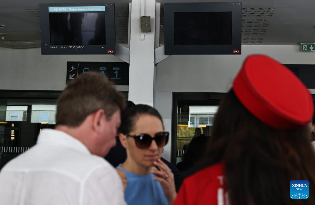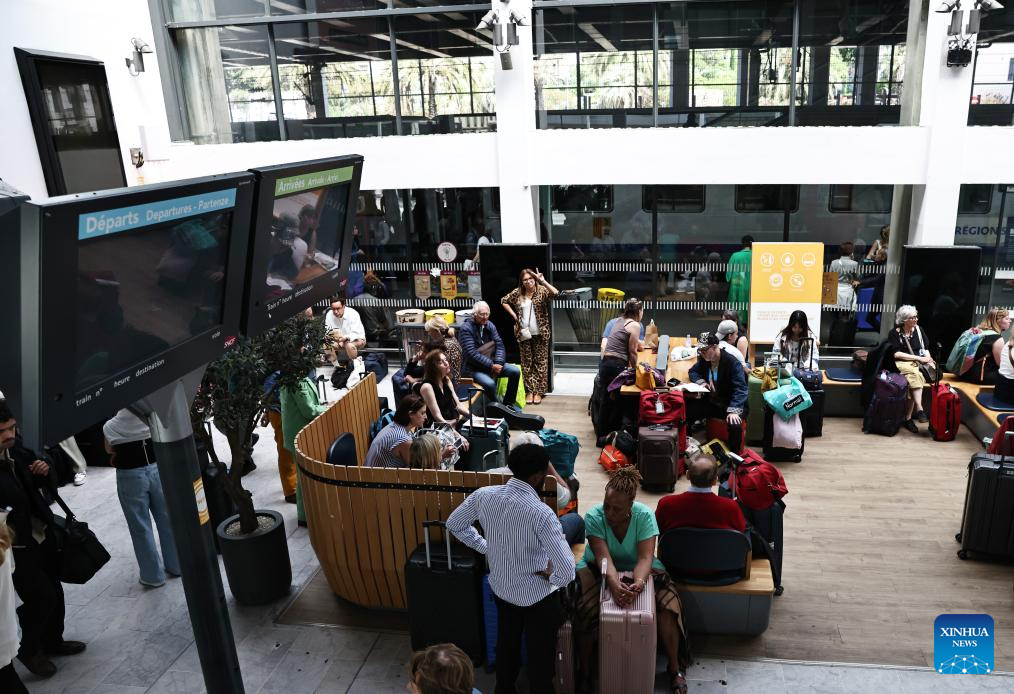Passengers wait inside the Cannes train station after a power outage in Cannes, southern France, on May 24, 2025. The Prefecture of the southern French Department of Alpes-Maritimes on Saturday confirmed that a power outage is affecting the western part of the department, including Cannes and its surroundings.