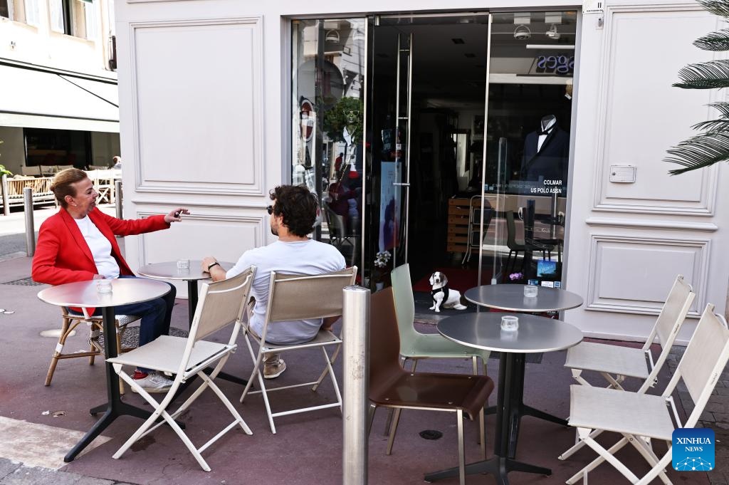 Customers are seen outside a restaurant after a power outage in Cannes, southern France, on May 24, 2025. The Prefecture of the southern French Department of Alpes-Maritimes on Saturday confirmed that a power outage is affecting the western part of the department, including Cannes and its surroundings.