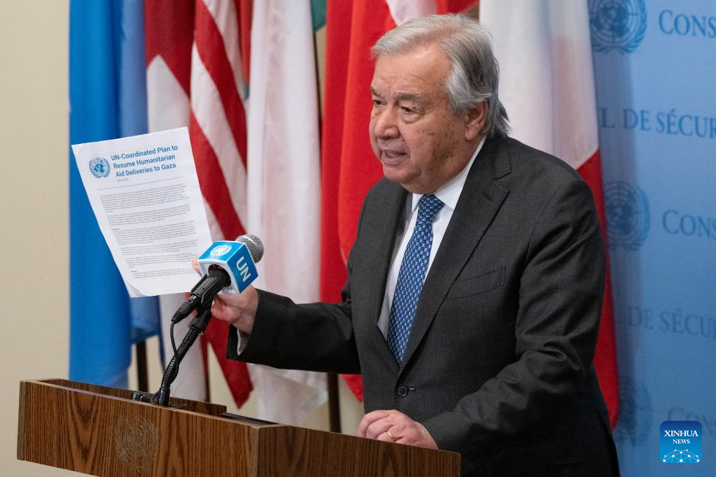 UN Secretary-General Antonio Guterres speaks at a press encounter on the humanitarian situation in Gaza at the UN headquarters in New York, on May 23, 2025. Guterres on Friday asked for more humanitarian aid into Gaza and for safety and security mitigation measures for delivery. (Evan Schneider/UN Photo/Handout via Xinhua)