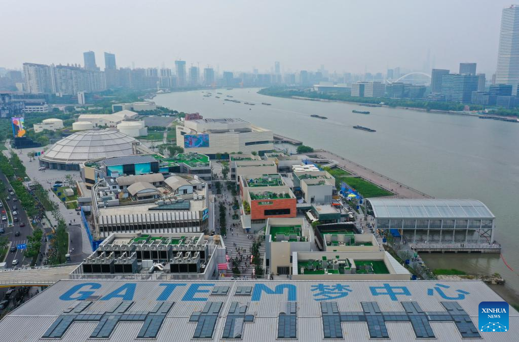 An aerial drone photo taken on May 17, 2025 shows Gate M, a cultural complex located near Huangpu River, in east China's Shanghai. In recent years, Shanghai has been promoting the construction of key public cultural facilities and cultural landmarks with Shanghai characteristics.