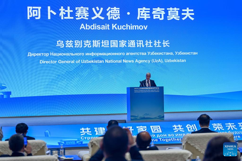 Abdisait Kuchimov, Director General of Uzbekistan National News Agency, speaks at the 2025 Media Cooperation Forum of SCO Countries held in Urumqi, northwest China's Xinjiang Uygur Autonomous Region, May 23, 2025. With the theme of "Building a Better Home Together for a Prosperous Future," the forum kicked off in Urumqi of Xinjiang on Friday. Over 300 representatives from mainstream media outlets, government departments, academic institutions, and enterprises from 26 SCO member states, observer states, and dialogue partners attended the forum. (Xinhua/Ding Lei)