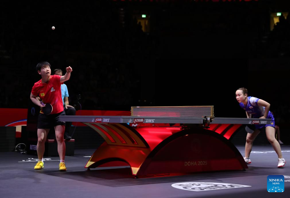 Sun Yingsha (L) hits a return during the women's singles semifinal between Sun Yingsha of China and Ito Mima of Japan at ITTF World Table Tennis Championships Finals Doha 2025 in Doha, Qatar, May 24, 2025. (Xinhua/He Changshan)