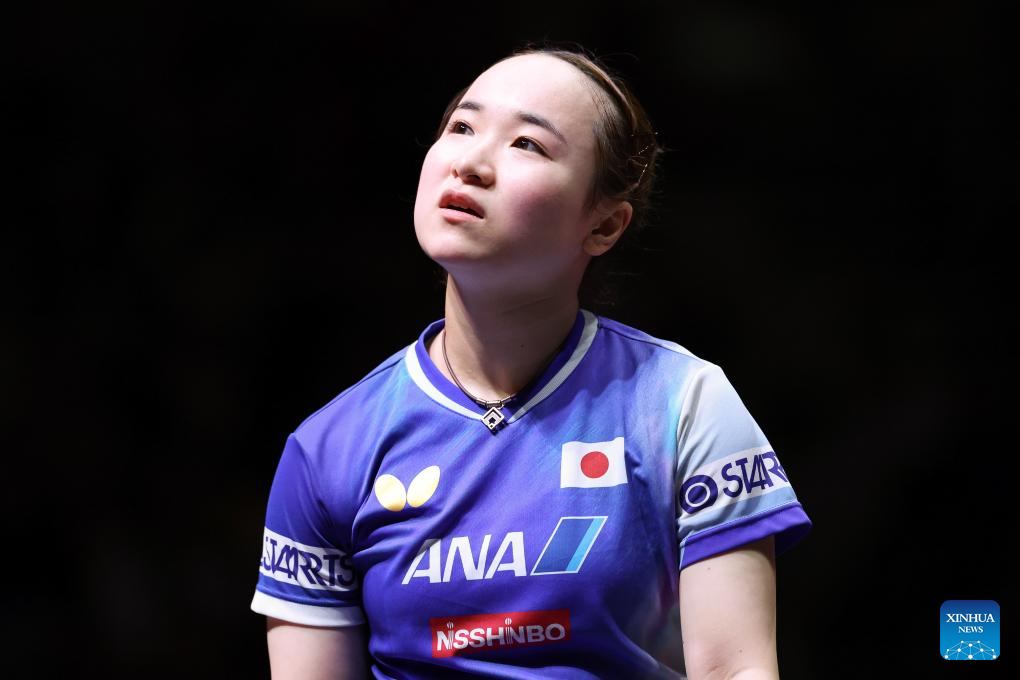 Ito Mima reacts during the women's singles semifinal between Sun Yingsha of China and Ito Mima of Japan at ITTF World Table Tennis Championships Finals Doha 2025 in Doha, Qatar, May 24, 2025. (Xinhua/Liu Xu)