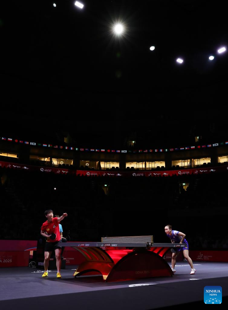 Sun Yingsha hits a return during the women's singles semifinal between Sun Yingsha of China and Ito Mima of Japan at ITTF World Table Tennis Championships Finals Doha 2025 in Doha, Qatar, May 24, 2025. (Xinhua/Liu Xu)