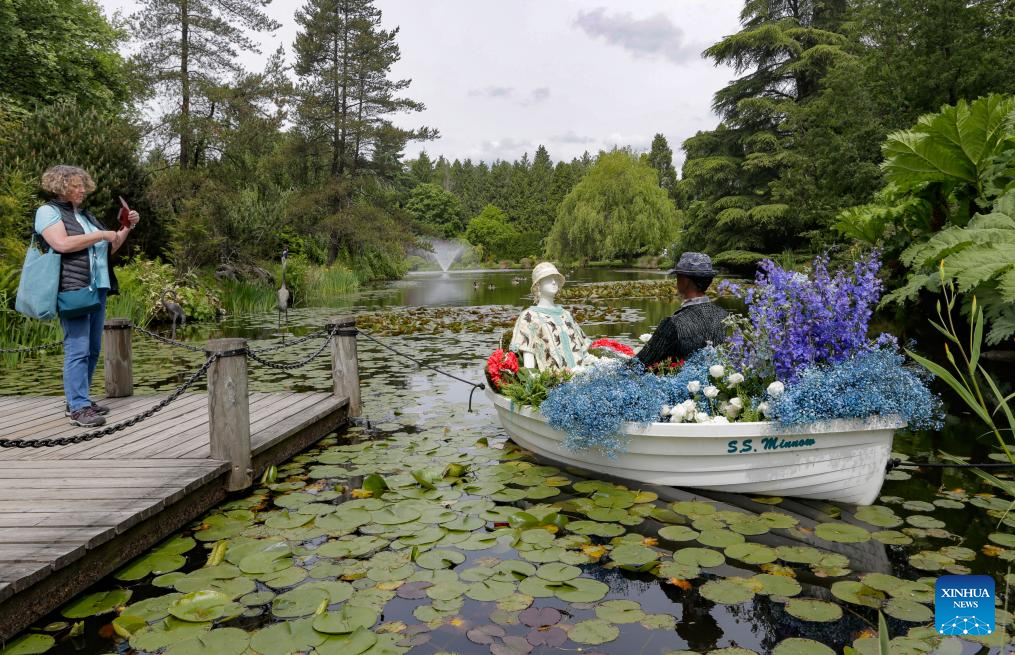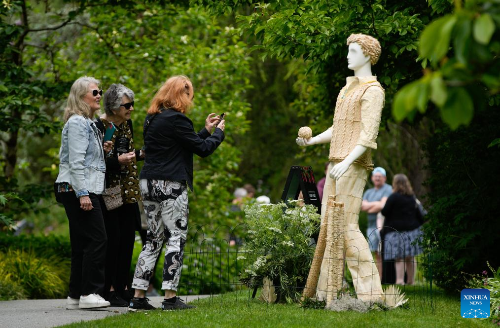Visitors look at a floral mannequin on display during the 2025 Fleurs de Villes DOWNTON ABBEY exhibition at VanDusen Botanical Garden in Vancouver, British Columbia, Canada, May 23, 2025. Featuring over 20 floral installations created by local florists, the event is held here from May 23 to June 1 this year. (Photo by Liang Sen/Xinhua)