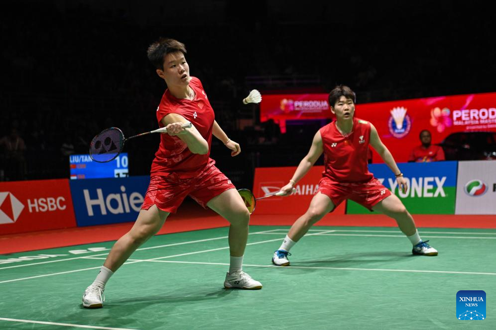 Liu Shengshu/Tan Ning (R) compete during the women's doubles semifinal between Liu Shengshu/Tan Ning of China and Apriyani Rahayu/Febi Setianingrum of Indonesia at 2025 Malaysia Masters badminton tournament in Kuala Lumpur, Malaysia, May 24, 2025. (Photo by Chong Voon Chung/Xinhua)