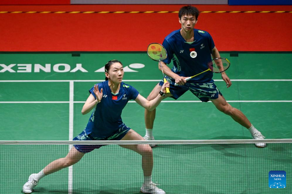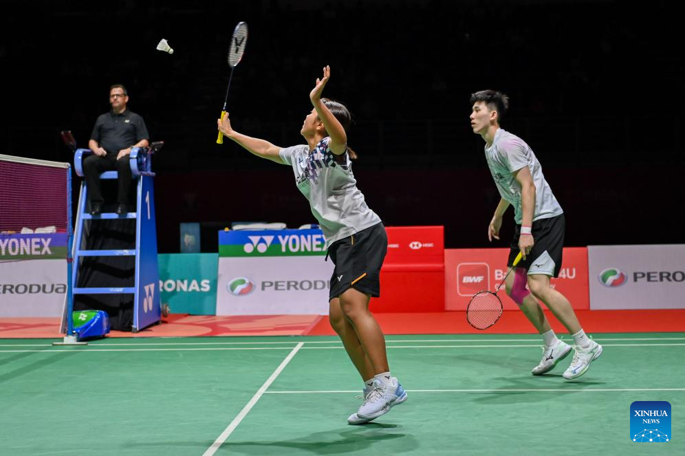 Cheng Xing (R)/Zhang Chi of China compete during the mixed doubles semifinal between Jiang Zhenbang/Wei Yaxin of China and Cheng Xing/Zhang Chi of China at the Malaysia Masters 2025 badminton tournament in Kuala Lumpur, Malaysia, May 24, 2025. (Photo by Chong Voon Chung/Xinhua)