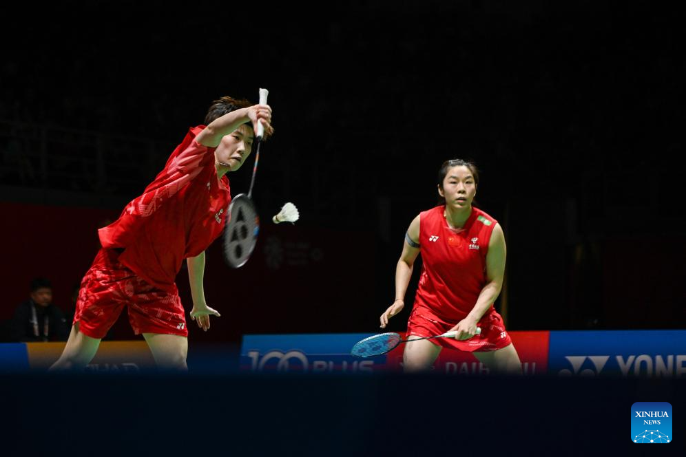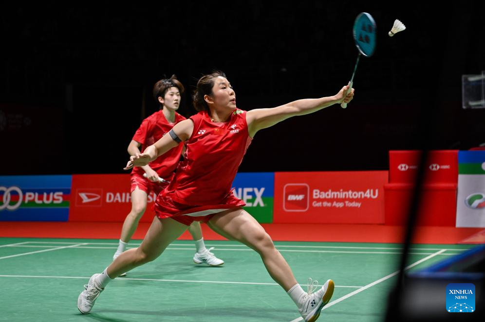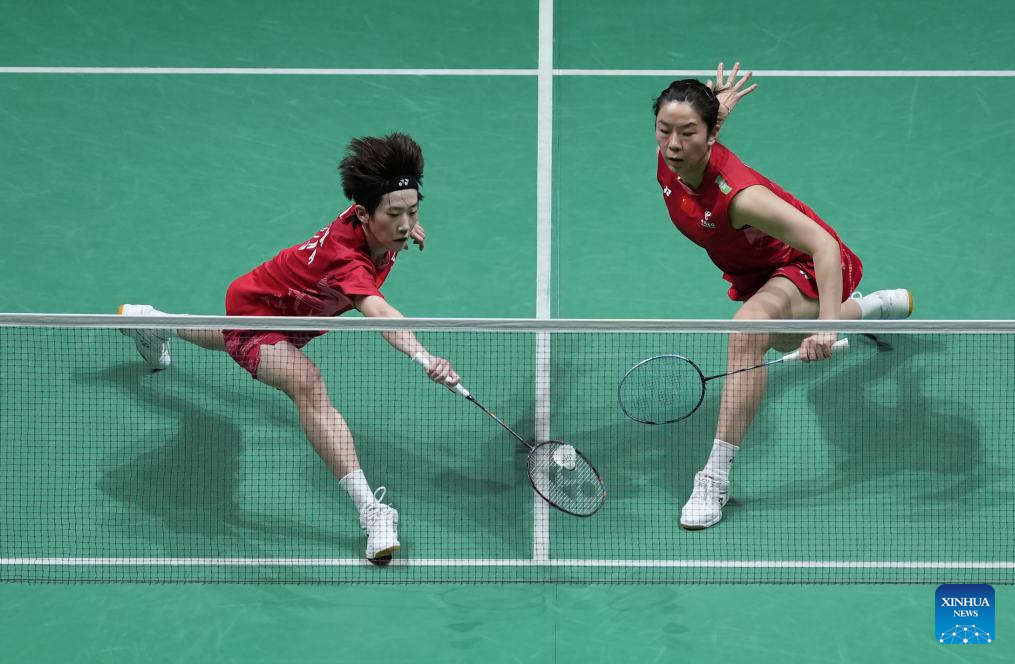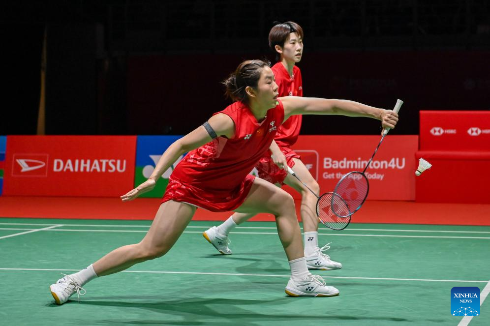Jia Yifan (R)/Zhang Shuxian compete during the women's doubles semifinal between Jia Yifan/Zhang Shuxian of China and Pearly Tan/Thinaah Muralitharan of Malaysia at 2025 Malaysia Masters badminton tournament in Kuala Lumpur, Malaysia, May 24, 2025. (Xinhua/Jia Haocheng)