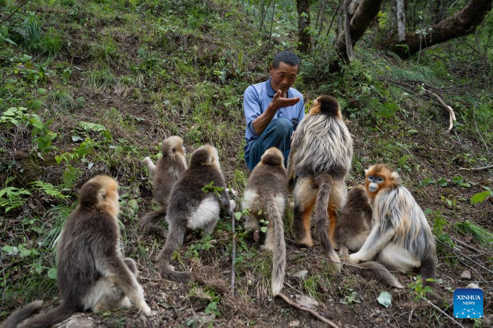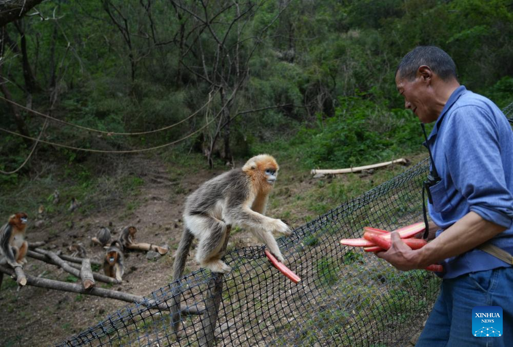 Xu Tingyou feeds Sichuan golden snub-nosed monkeys in the Pingwu Sichuan golden snub-nosed monkey popular science education base in Pingwu County, Mianyang City of southwest China's Sichuan Province, May 21, 2025. Located within the Xiaohegou Nature Reserve, a provincial-level nature reserve in Sichuan Province, Pingwu Sichuan golden snub-nosed monkey popular science education base is home to over 40 Sichuan golden snub-nosed monkeys. According to the latest monitoring data of 2024, Xiaohegou Nature Reserve is the habitat of about 1,000 Sichuan golden snub-nosed monkeys.