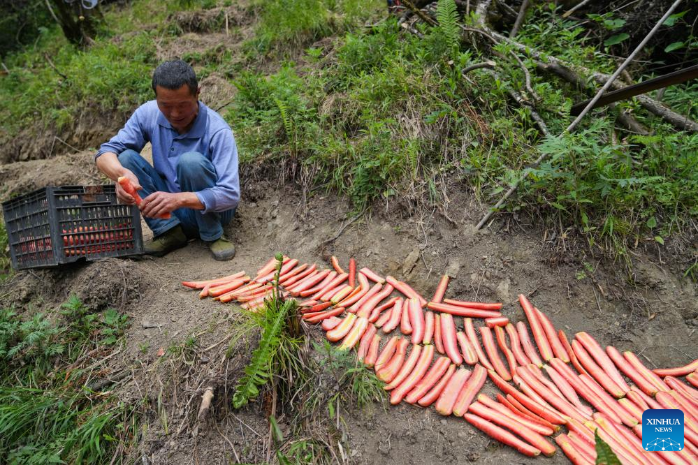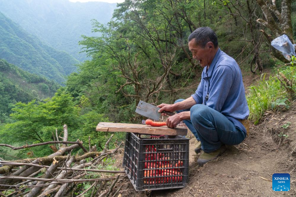 Xu Tingyou prepares food for Sichuan golden snub-nosed monkeys in the Pingwu Sichuan golden snub-nosed monkey popular science education base in Pingwu County, Mianyang City of southwest China's Sichuan Province, May 21, 2025. Located within the Xiaohegou Nature Reserve, a provincial-level nature reserve in Sichuan Province, Pingwu Sichuan golden snub-nosed monkey popular science education base is home to over 40 Sichuan golden snub-nosed monkeys. According to the latest monitoring data of 2024, Xiaohegou Nature Reserve is the habitat of about 1,000 Sichuan golden snub-nosed monkeys.