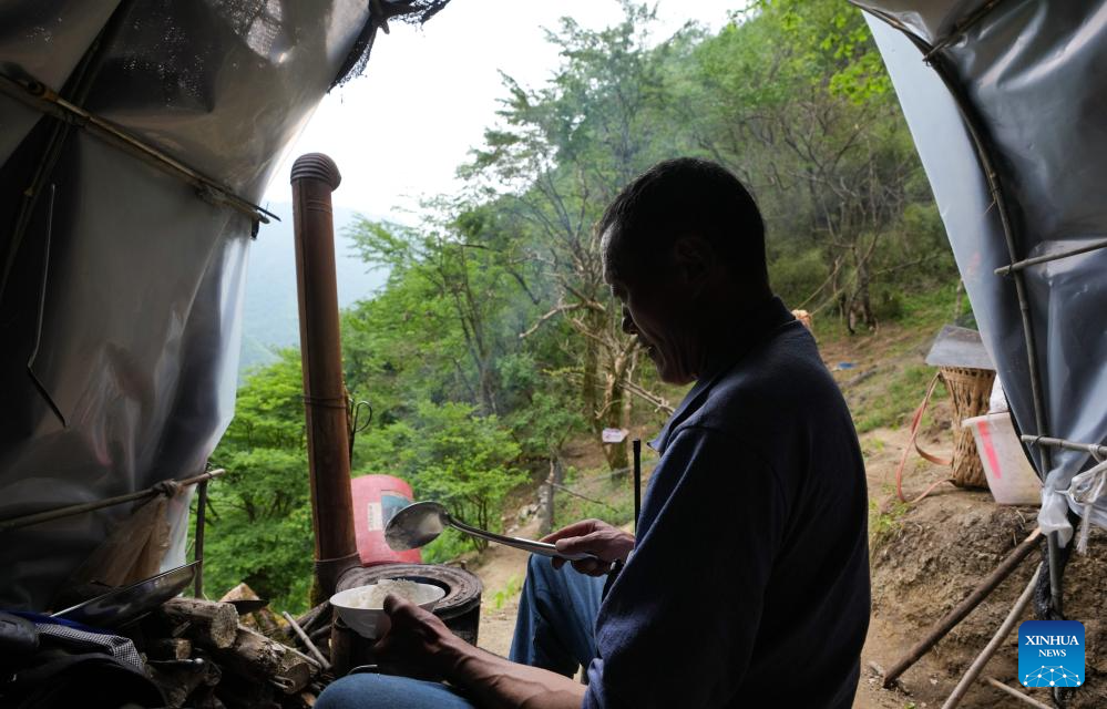 Xu Tingyou has his meal at a shelter in the Pingwu Sichuan golden snub-nosed monkey popular science education base in Pingwu County, Mianyang City of southwest China's Sichuan Province, May 21, 2025. Located within the Xiaohegou Nature Reserve, a provincial-level nature reserve in Sichuan Province, Pingwu Sichuan golden snub-nosed monkey popular science education base is home to over 40 Sichuan golden snub-nosed monkeys. According to the latest monitoring data of 2024, Xiaohegou Nature Reserve is the habitat of about 1,000 Sichuan golden snub-nosed monkeys.