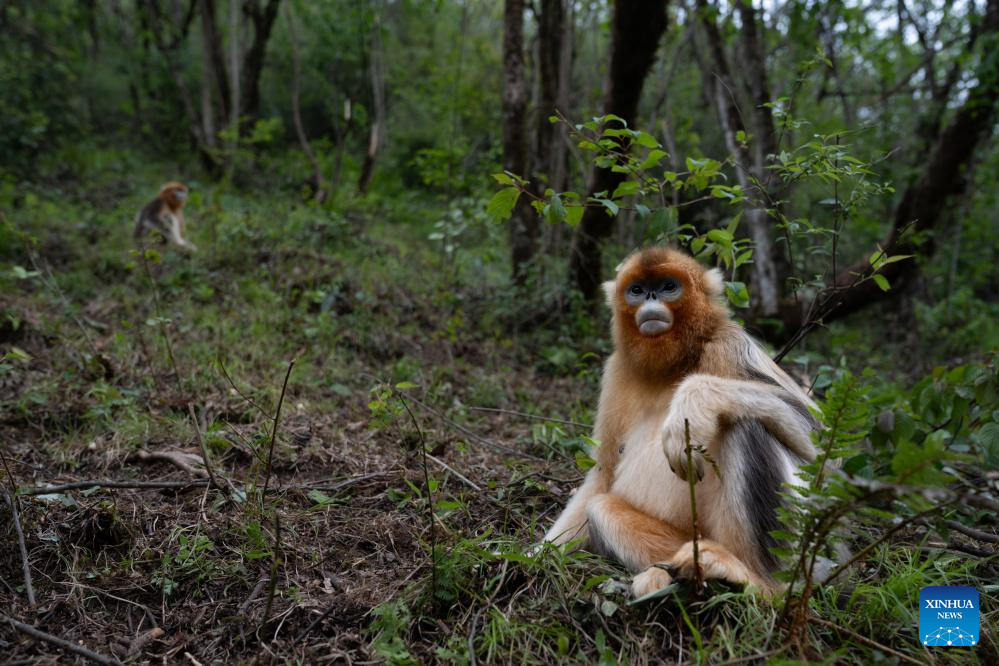 A Sichuan golden snub-nosed monkey is pictured in the Pingwu Sichuan golden snub-nosed monkey popular science education base in Pingwu County, Mianyang City of southwest China's Sichuan Province, May 21, 2025. Located within the Xiaohegou Nature Reserve, a provincial-level nature reserve in Sichuan Province, Pingwu Sichuan golden snub-nosed monkey popular science education base is home to over 40 Sichuan golden snub-nosed monkeys. According to the latest monitoring data of 2024, Xiaohegou Nature Reserve is the habitat of about 1,000 Sichuan golden snub-nosed monkeys.