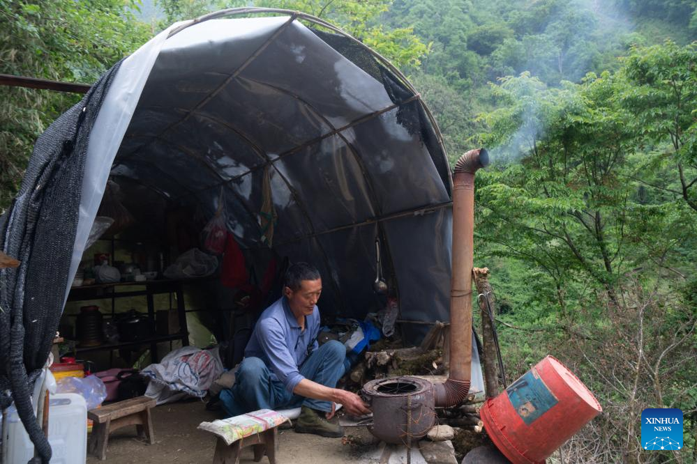Xu Tingyou cooks his meal at a shelter in the Pingwu Sichuan golden snub-nosed monkey popular science education base in Pingwu County, Mianyang City of southwest China's Sichuan Province, May 21, 2025. Located within the Xiaohegou Nature Reserve, a provincial-level nature reserve in Sichuan Province, Pingwu Sichuan golden snub-nosed monkey popular science education base is home to over 40 Sichuan golden snub-nosed monkeys. According to the latest monitoring data of 2024, Xiaohegou Nature Reserve is the habitat of about 1,000 Sichuan golden snub-nosed monkeys.