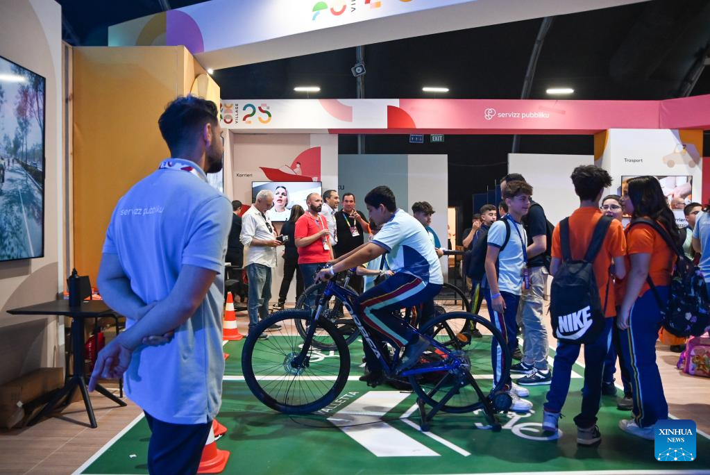 A student rides a bicycle in front of a visual street display at the third edition of the Public Service Expo in Ta' Qali, Attard, Malta, on May 23, 2025. The third edition of the Public Service Expo is being held at the Malta Fairs and Conventions Center in Ta' Qali. The five-day event, which kicked off on Wednesday, will run until Sunday. (Photo by Jonathan Borg/Xinhua)