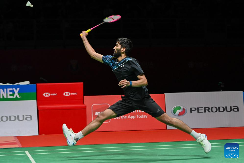 Srikanth Kidambi of India hits a return during the men's singles final match between Li Shifeng of China and Srikanth Kidambi of India at the Malaysia Masters 2025 badminton tournament in Kuala Lumpur, Malaysia, May 25, 2025. (Photo by Chong Voon Chung/Xinhua)