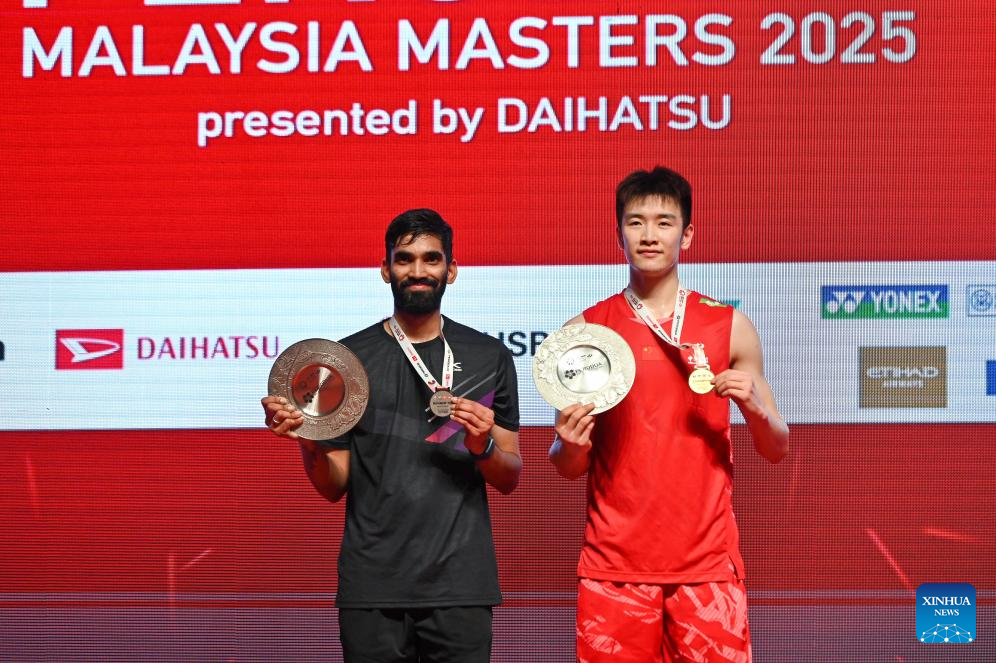 Gold medalist Li Shifeng (R) of China and silver medalist Srikanth Kidambi of India pose for photos during the awarding ceremony after their men's singles final match at the Malaysia Masters 2025 badminton tournament in Kuala Lumpur, Malaysia, May 25, 2025. (Photo by Chong Voon Chung/Xinhua)