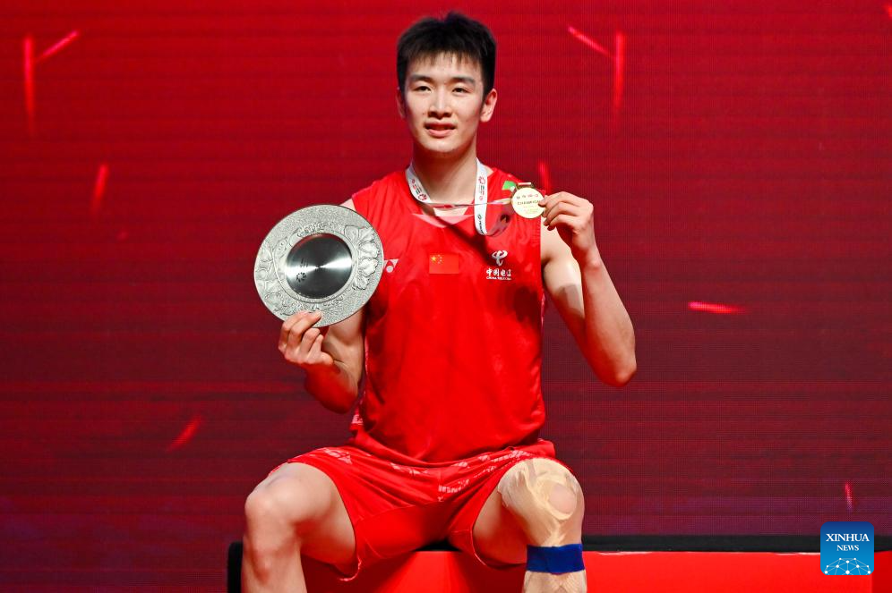 Gold medalist Li Shifeng of China poses for photos during the awarding ceremony after the men's singles final match between Li Shifeng of China and Srikanth Kidambi of India at the Malaysia Masters 2025 badminton tournament in Kuala Lumpur, Malaysia, May 25, 2025. (Photo by Chong Voon Chung/Xinhua)