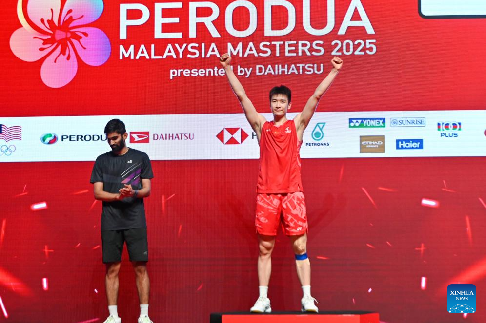 Gold medalist Li Shifeng (R) of China celebrates during the awarding ceremony after the men's singles final match between Li Shifeng of China and Srikanth Kidambi of India at the Malaysia Masters 2025 badminton tournament in Kuala Lumpur, Malaysia, May 25, 2025. (Photo by Chong Voon Chung/Xinhua)