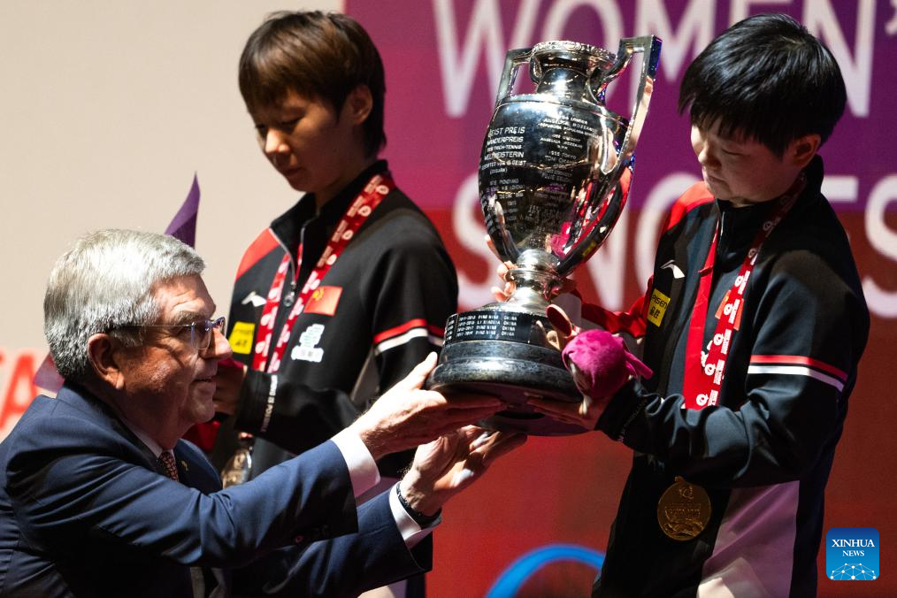 Thomas Bach (front L), president of the International Olympic Committee (IOC), passes the trophy to gold medslist Sun Yingsha (front R) of China during the awarding ceremony for the women's singles event at ITTF World Table Tennis Championships Finals Doha 2025 in Doha, Qatar, May 25, 2025. (Xinhua/Xiao Yijiu)