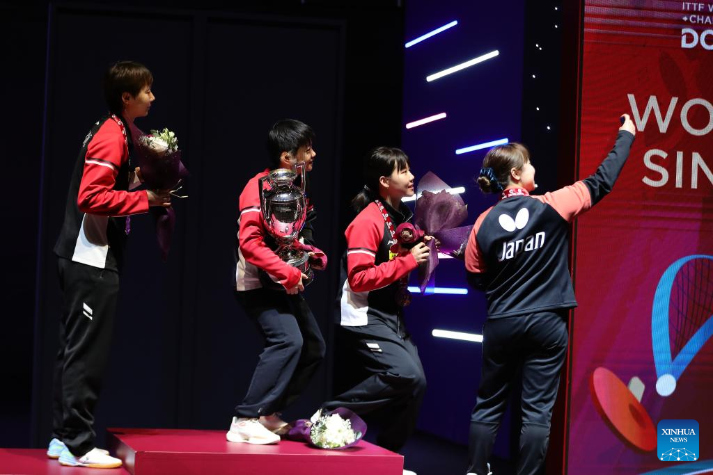 Gold medalist Sun Yingsha (2nd L) of China, silver medalist Wang Manyu (1st L) of China, bronze medalists Chen Xingtong (2nd R) of China and Ito Mima of Japan pose during the awarding ceremony for the women's singles event at ITTF World Table Tennis Championships Finals Doha 2025 in Doha, Qatar, May 25, 2025. (Xinhua/Wang Dongzhen)