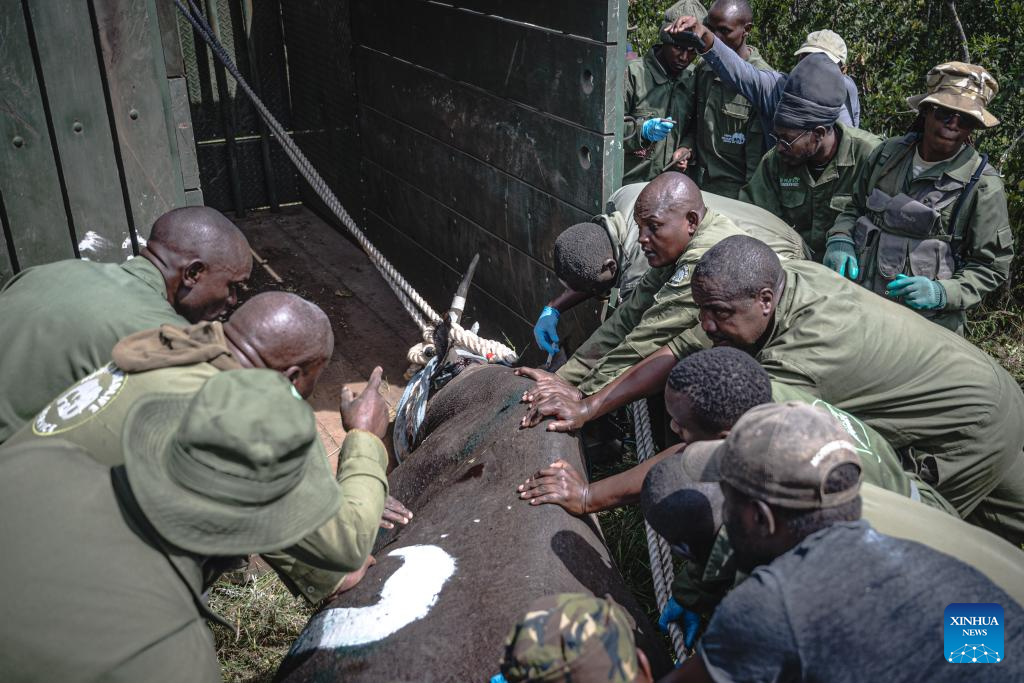 Members of the Kenya Wildlife Service (KWS) move a tranquilized black rhino during a translocation exercise at Ol Pejeta Conservancy in Laikipia, Kenya, on May 24, 2025. (Xinhua/Wang Guansen)