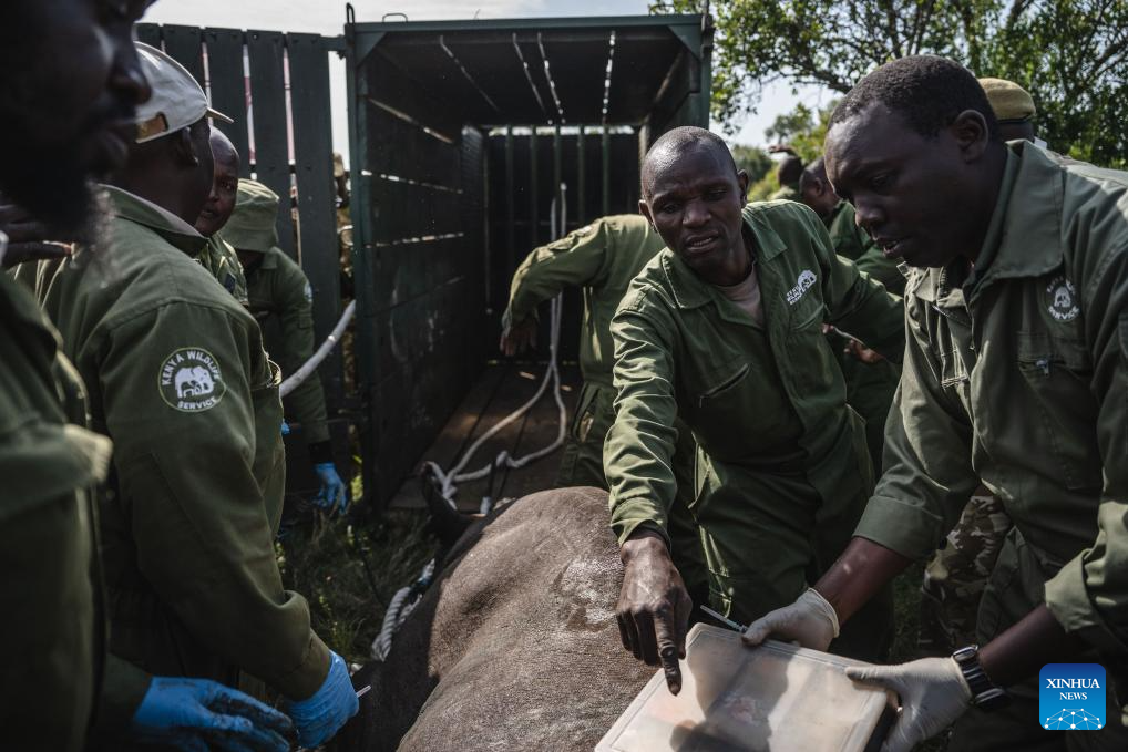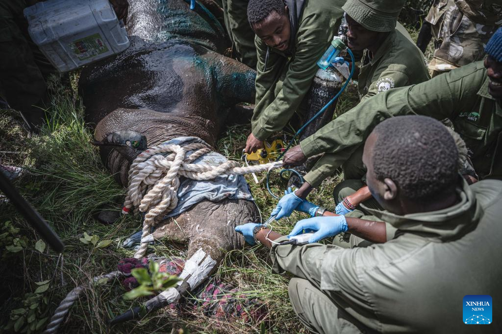 Members of the Kenya Wildlife Service (KWS) examine a black rhino at Ol Pejeta Conservancy in Laikipia, Kenya, on May 24, 2025. (Xinhua/Wang Guansen)