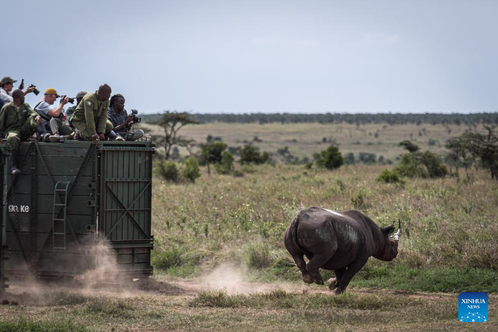 Members of the Kenya Wildlife Service (KWS) release a relocated black rhino at Segera Conservancy in Laikipia, Kenya, on May 24, 2025. (Xinhua/Wang Guansen)