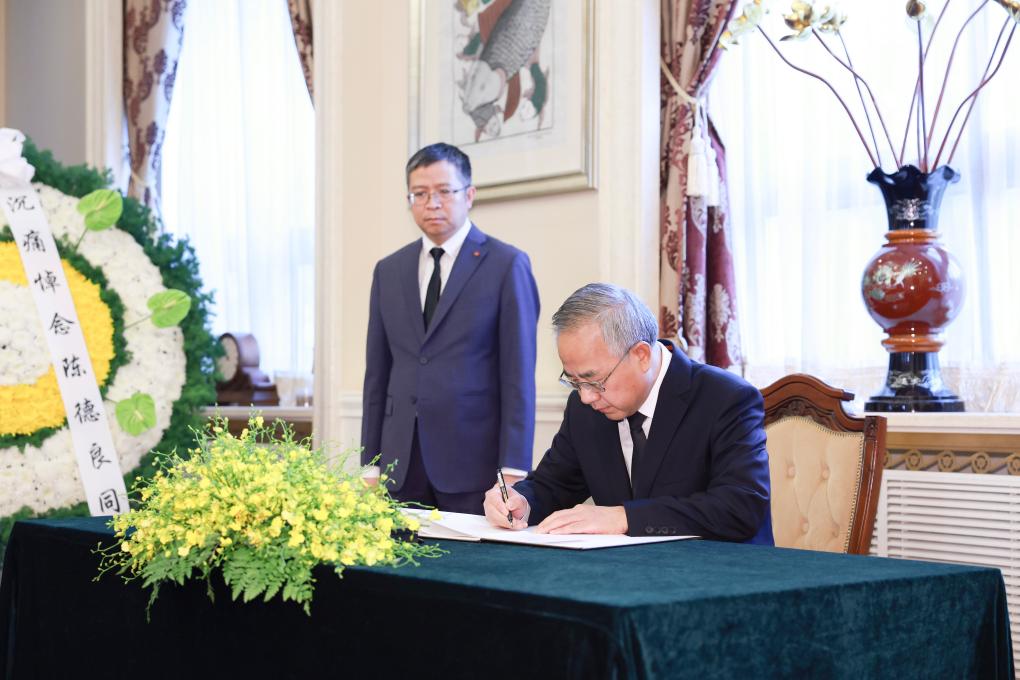 Hu Chunhua, vice chairman of the National Committee of the Chinese People's Political Consultative Conference, visits the Embassy of Vietnam in China to mourn the passing of former Vietnamese President Tran Duc Luong on behalf of the Chinese side in Beijing, capital of China, May 25, 2025. (Xinhua/Ding Haitao)
