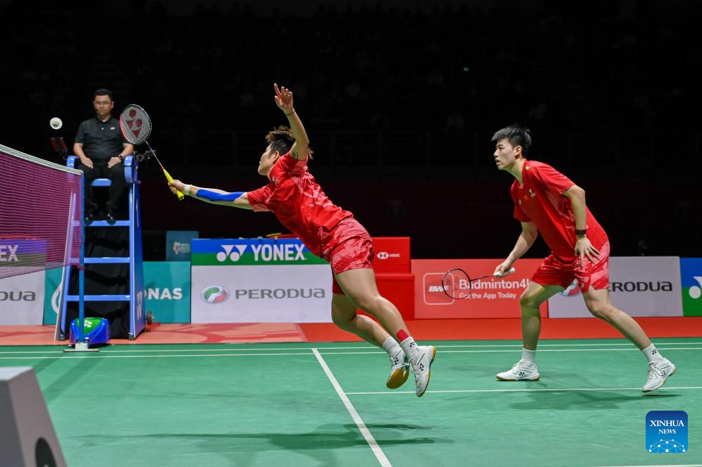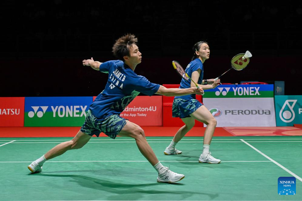 Jiang Zhenbang (L)/Wei Yaxin of China compete during the mixed doubles final against Feng Yanzhe/Huang Dongping of China of China at the Malaysia Masters 2025 badminton tournament in Kuala Lumpur, Malaysia, May 25, 2025. (Photo by Chong Voon Chung/Xinhua)