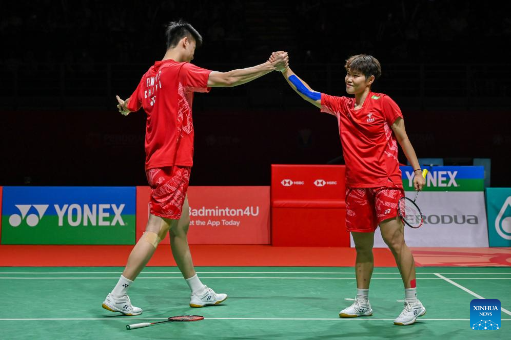 Feng Yanzhe/Huang Dongping (R) of China celebrate after the mixed doubles final against Jiang Zhenbang/Wei Yaxin of China at the Malaysia Masters 2025 badminton tournament in Kuala Lumpur, Malaysia, May 25, 2025. (Photo by Chong Voon Chung/Xinhua)