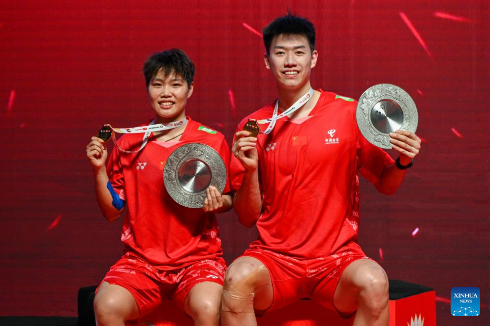 Gold medalists Feng Yanzhe (R)/Huang Dongping of China pose for a photo during the awarding ceremony after the mixed doubles final against Jiang Zhenbang/Wei Yaxin of China at the Malaysia Masters 2025 badminton tournament in Kuala Lumpur, Malaysia, May 25, 2025. (Photo by Chong Voon Chung/Xinhua)