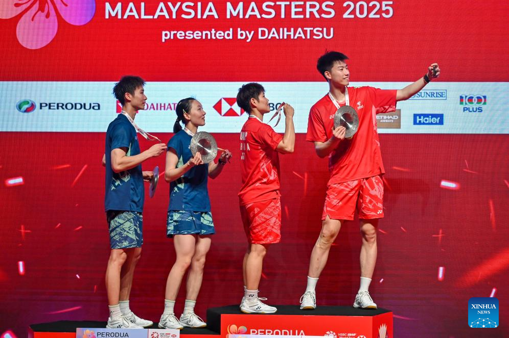 Gold medalists Feng Yanzhe (1st R)/Huang Dongping (2nd R) of China take a selfie with silver medalists Jiang Zhenbang (1st L)/Wei Yaxin of China during the awarding ceremony after their mixed doubles final at the Malaysia Masters 2025 badminton tournament in Kuala Lumpur, Malaysia, May 25, 2025. (Photo by Chong Voon Chung/Xinhua)