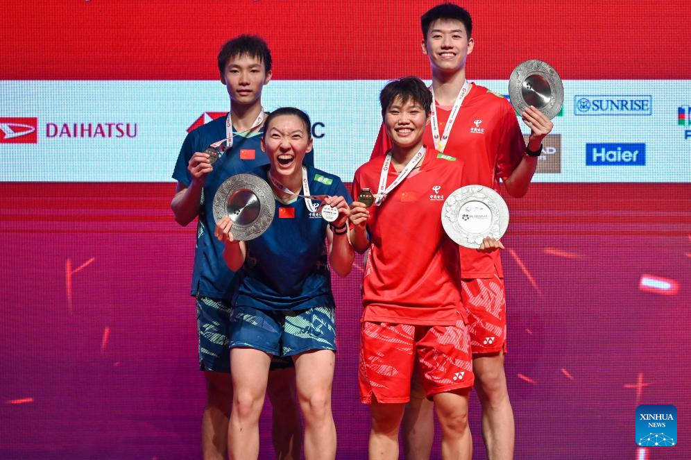 Gold medalists Feng Yanzhe (1st R)/Huang Dongping (2nd R) of China and silver medalists Jiang Zhenbang (1st L)/Wei Yaxin of China pose during the awarding ceremony after their mixed doubles final at the Malaysia Masters 2025 badminton tournament in Kuala Lumpur, Malaysia, May 25, 2025. (Photo by Chong Voon Chung/Xinhua)