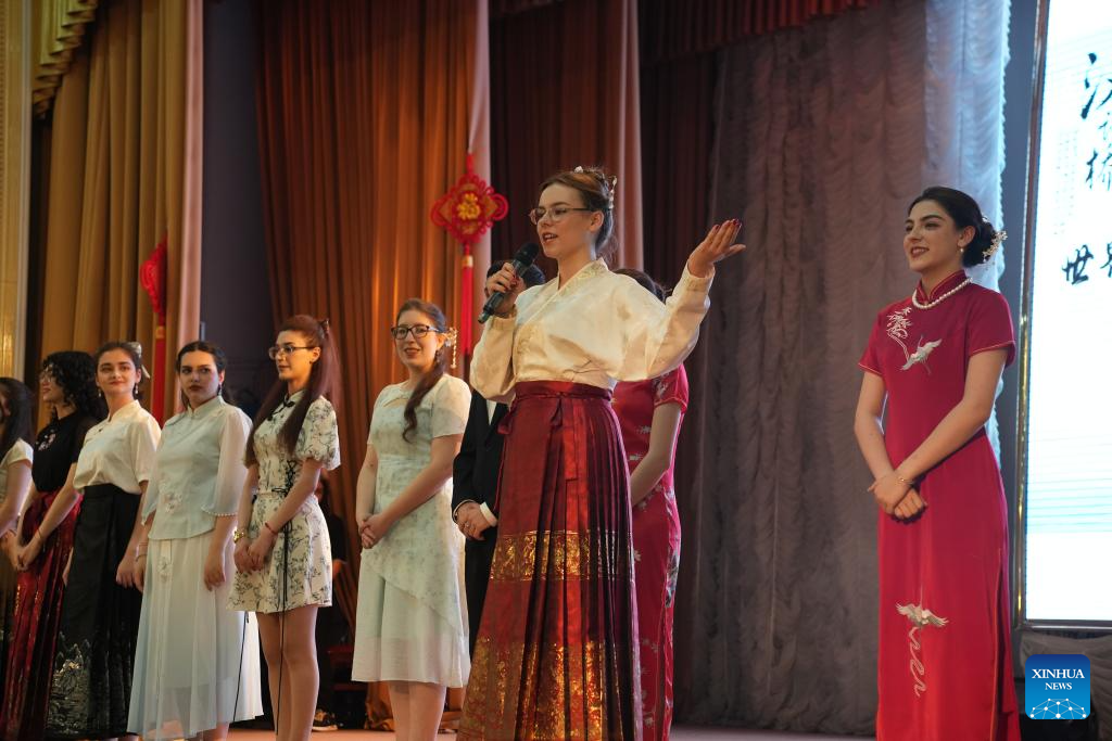 A contestant performs at the 24th "Chinese Bridge" Chinese proficiency competition for Azerbaijani college students at Baku State University in Baku, Azerbaijan, May 21, 2025. (Photo by Humbet Mamadov/Xinhua)