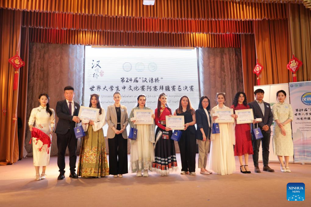 People take photos at the 24th "Chinese Bridge" Chinese proficiency competition for Azerbaijani college students at Baku State University in Baku, Azerbaijan, May 21, 2025. (Photo by Humbet Mamadov/Xinhua)