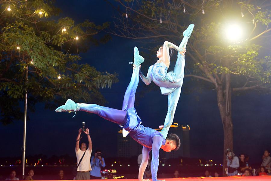 During the one-hour performance, the artists entertained strollers at the pedestrianized Walking Street along the riverside Sisowath Quay with a variety of performance arts, including traditional music, dance, and acrobatics, among others.