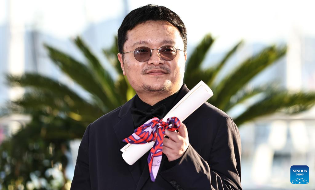 Chinese director Bi Gan poses for a photocall after receiving a Special Award for the film "Kuang ye shi dai" (Resurrection) during the closing ceremony of the 78th edition of the Cannes Film Festival in Cannes, southern France, on May 24, 2025. (Xinhua/Gao Jing)