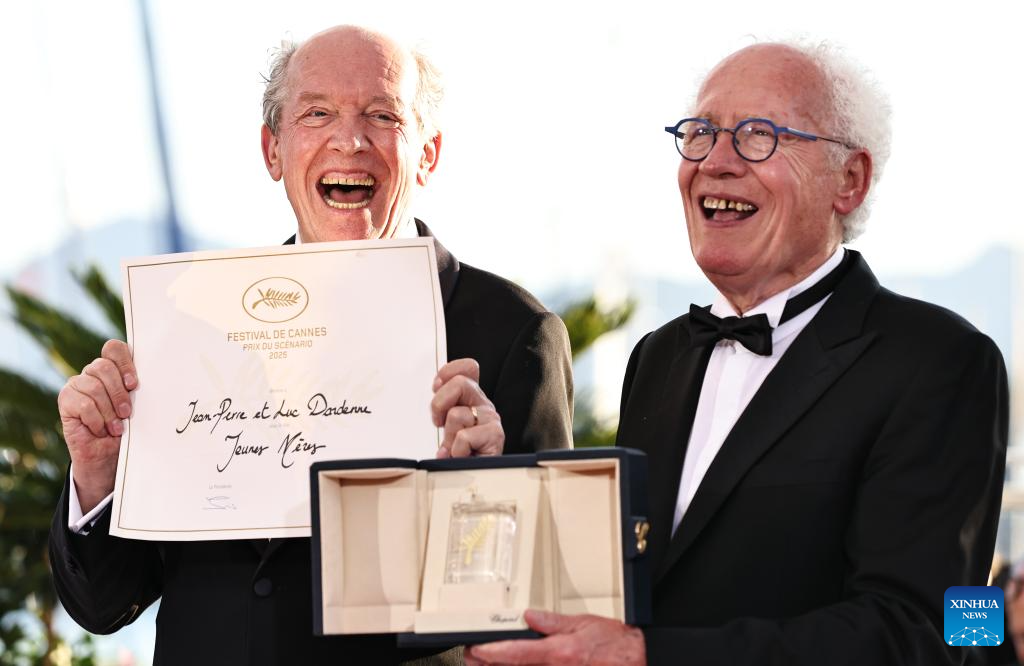 Belgium's Luc Dardenne (L) and Dardenne and Jean-Pierre Dardenne pose during a photocall after winning the Best Screenplay prize for the film "Jeunes Meres" (Young Mothers) during the closing ceremony of the 78th edition of the Cannes Film Festival in Cannes, southern France, on May 24, 2025. (Xinhua/Gao Jing)