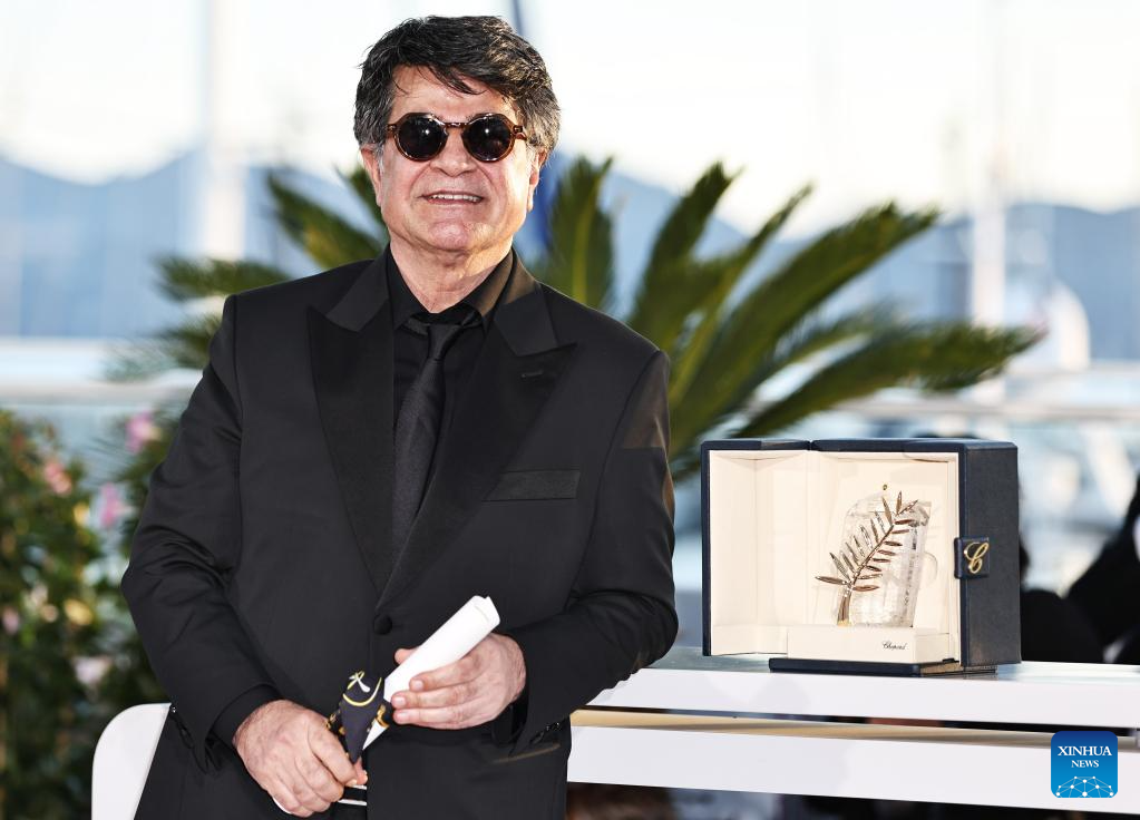 Iranian director Jafar Panahi poses with the trophy during a photocall after winning the Palme d'Or for the film "A Simple Accident" during the closing ceremony of the 78th edition of the Cannes Film Festival in Cannes, southern France, on May 24, 2025. (Xinhua/Gao Jing)