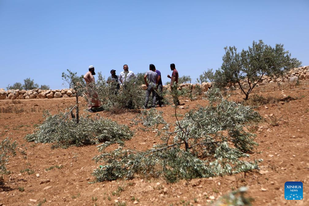Palestinians check on olive trees vandalized by Israeli settlers in the Yatta area, south of the West Bank city of Hebron, on May 24, 2025. (Photo by Mamoun Wazwaz/Xinhua)