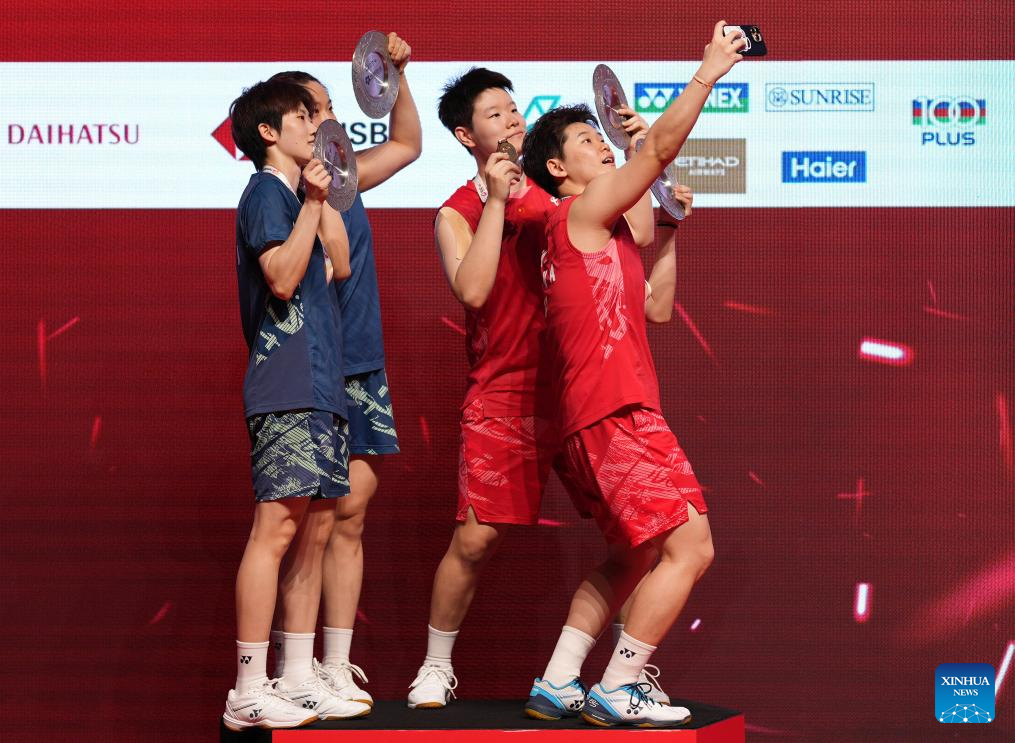 Liu Shengshu (top R)/Tan Ning (bottom R) of China and Jia Yifan/Zhang Shuxian (bottom L) of China pose during the women's doubles awarding ceremony at the Malaysia Masters 2025 badminton tournament in Kuala Lumpur, Malaysia, May 25, 2025. (Xinhua/Jia Haocheng)