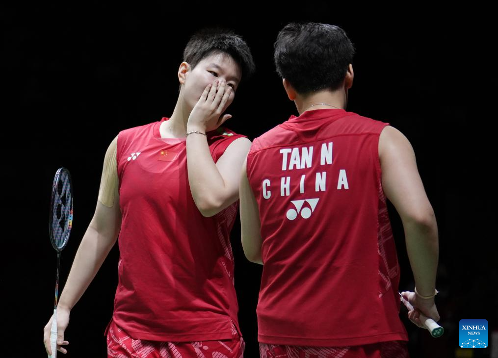 Liu Shengshu/Tan Ning (R) communicate during the women's doubles final between Liu Shengshu/Tan Ning of China and Jia Yifan/Zhang Shuxian of China at the Malaysia Masters 2025 badminton tournament in Kuala Lumpur, Malaysia, May 25, 2025. (Xinhua/Jia Haocheng)