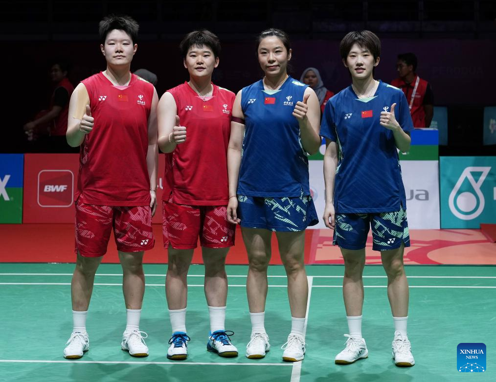 Liu Shengshu (1st L)/Tan Ning (2nd L) of China and Jia Yifan/Zhang Shuxian (1st R) of China pose after the women's doubles final at the Malaysia Masters 2025 badminton tournament in Kuala Lumpur, Malaysia, May 25, 2025. (Xinhua/Jia Haocheng)
