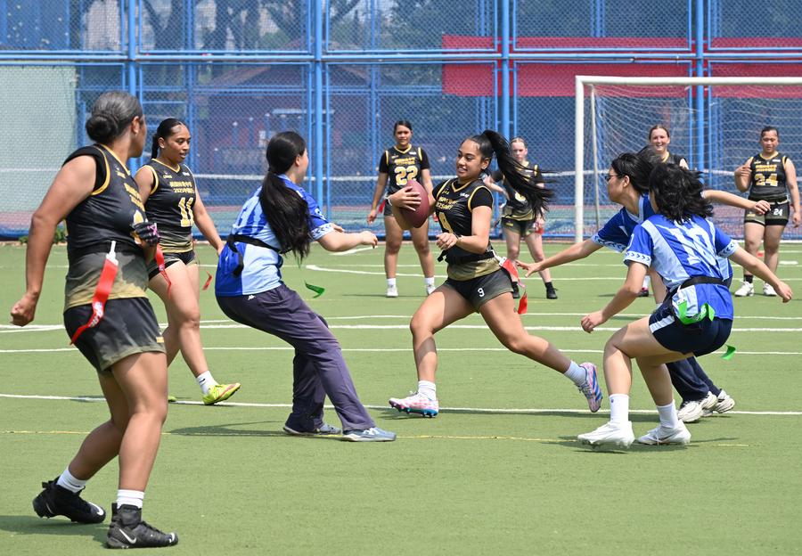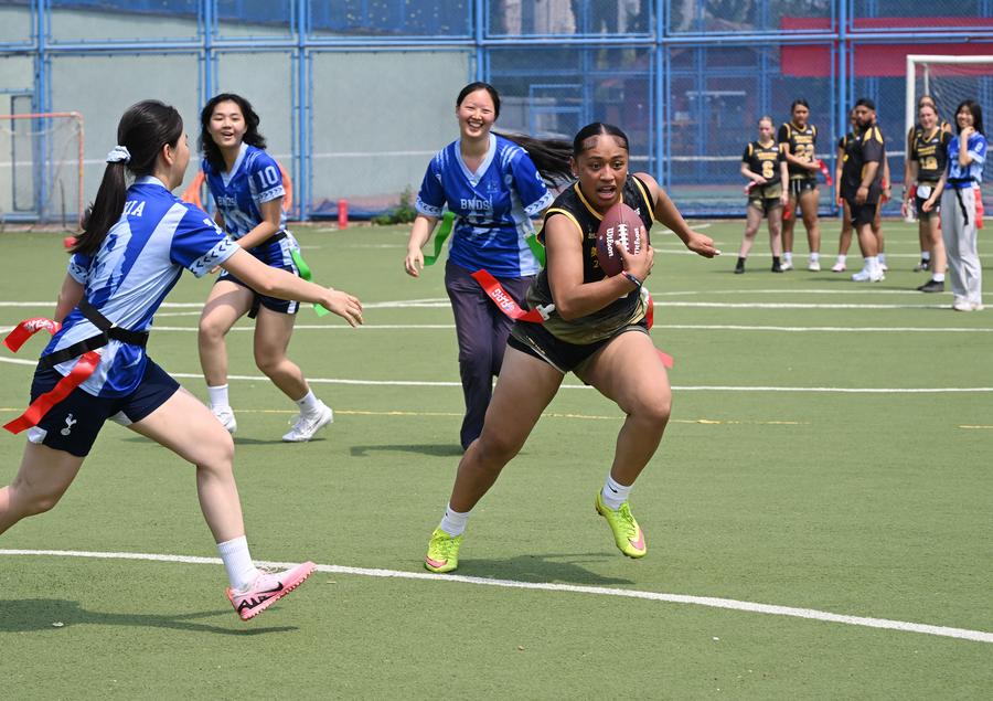 Students of Lincoln High School and Beijing National Day School compete during the NFL FLAG China-U.S. Youth Flag Football Exchange Event & Lincoln High School 2025 China Tour at Beijing National Day School in Beijing, capital of China, May 26, 2025. (Xinhua/Li He)